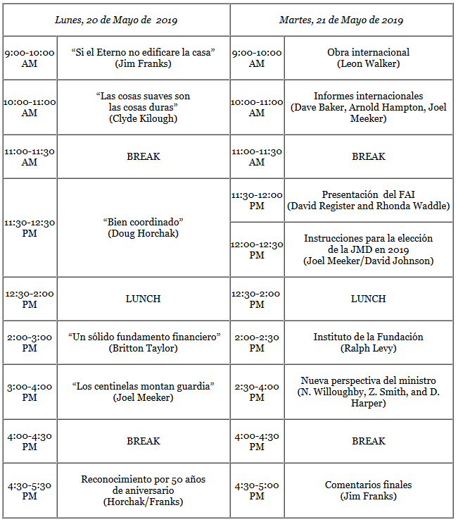 Durante la conferencia este año, ocho ministros serán homenajeados por haber completado 50 años en el ministerio. Éstos son (en orden alfabético): Bob Peoples, Harold Rhodes, Richard Rand, Larry Salyer, Paul Suckling, Richard Thompson, Lyle Welty y Roger West. Nos sentimos profundamente agradecidos por su fidelidad al camino de vida de Dios y nos complace hacerles este reconocimiento (1 Timoteo 5:17).